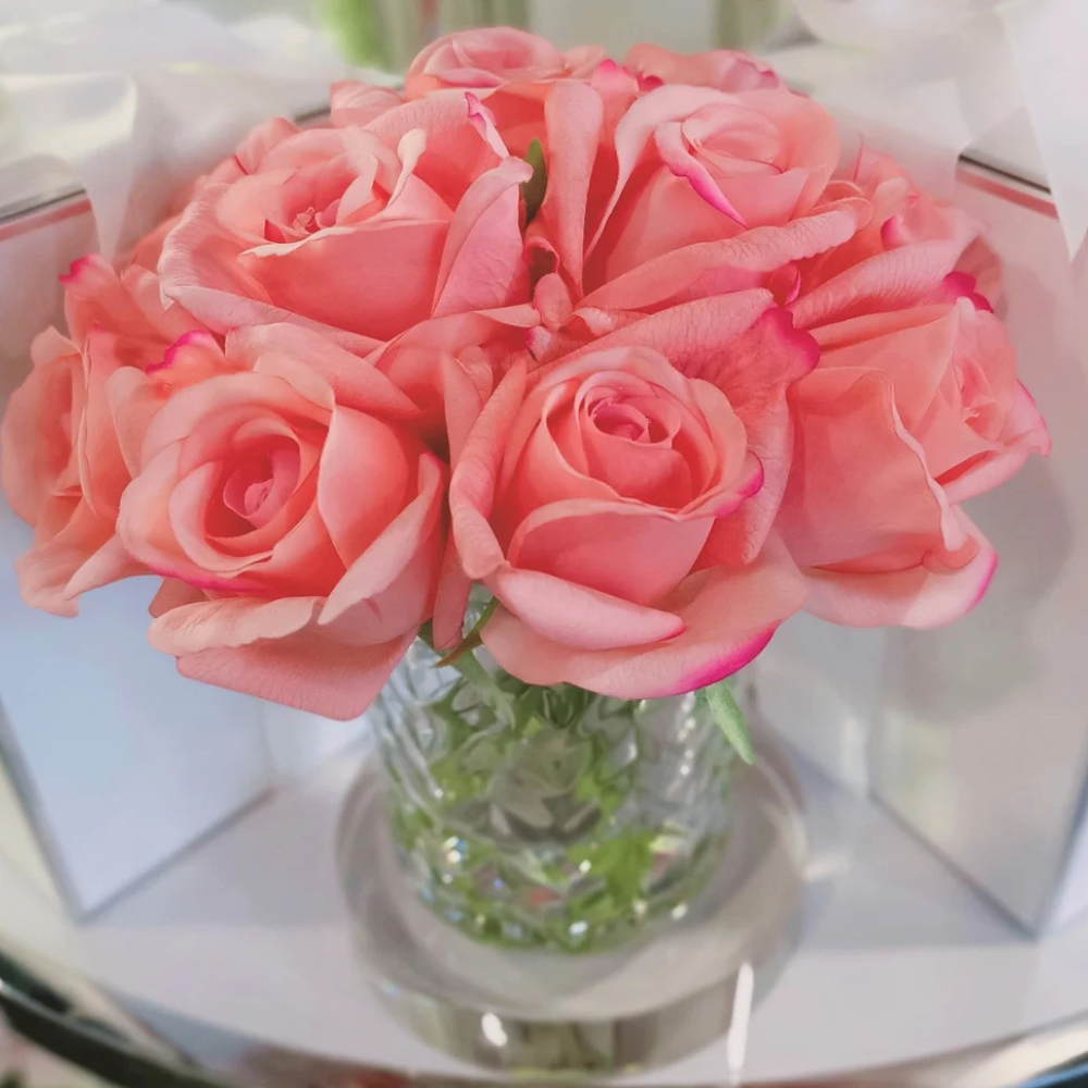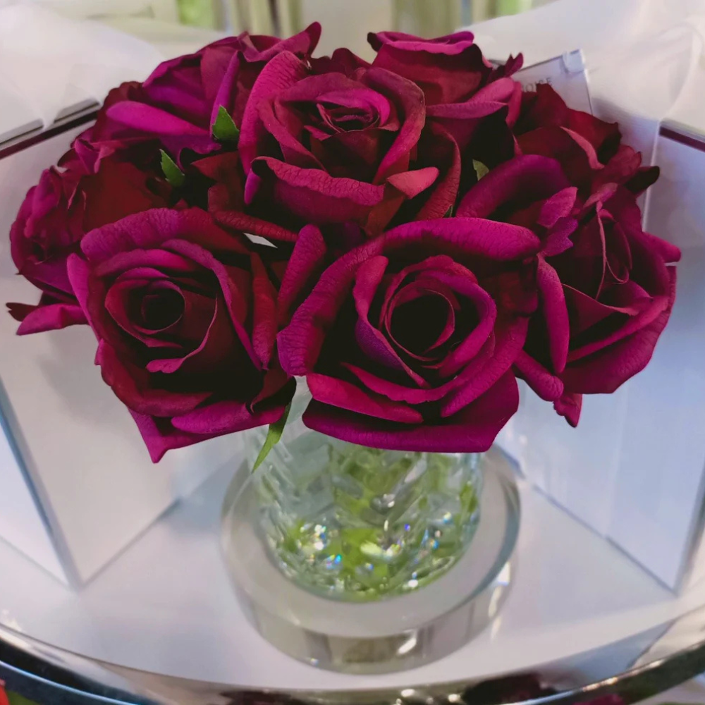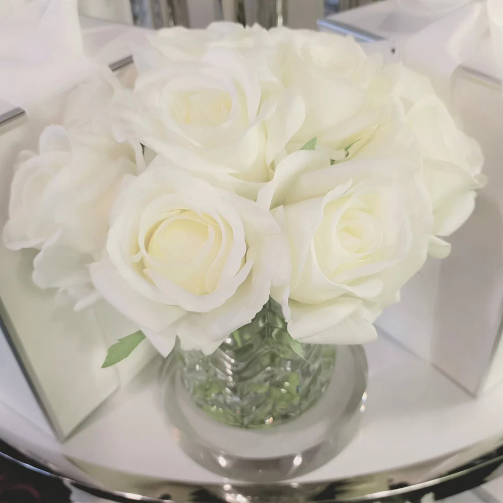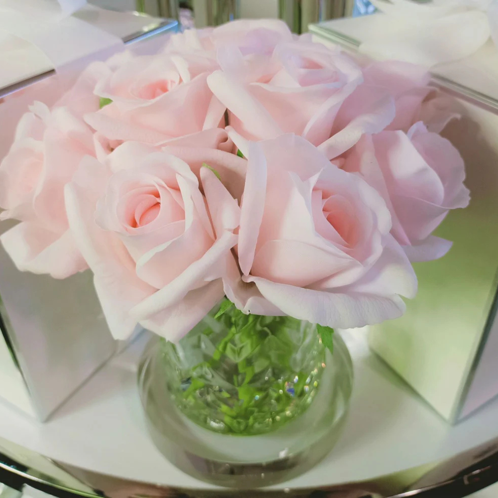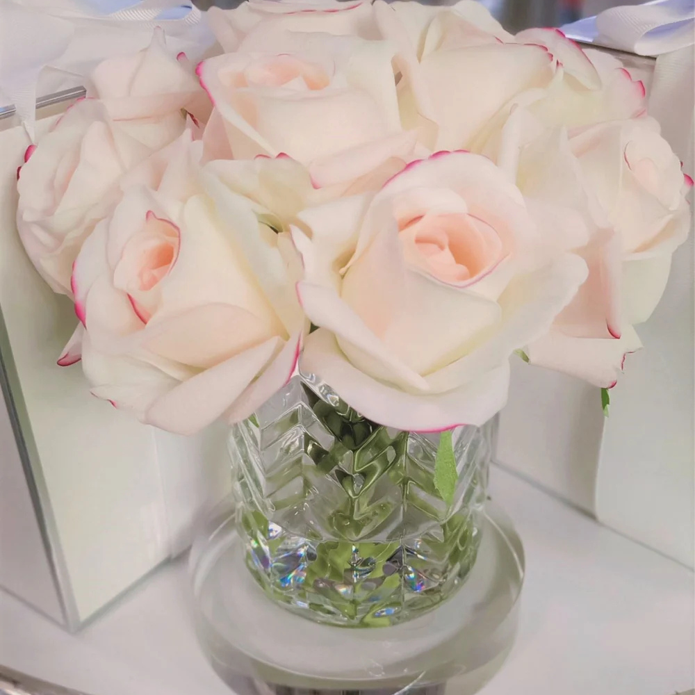 Each life-like perfumed Herringbone Rose Bud arrangement has been skilfully hand crafted and is set in gel giving it the appearance of water. Each petal has a special natural coating to give them a true to life touch & appearance. Arranged in a clear herringbone vase.