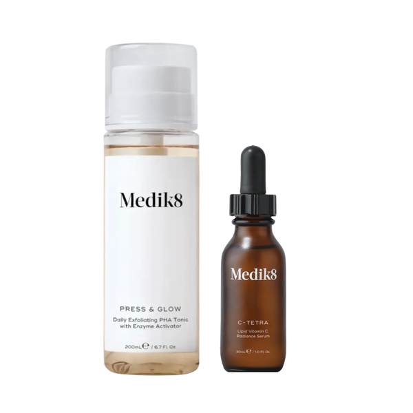 Medik8 Press & Glow features 5.5% Gluconolactone, a gentle PHA exfoliator that smooths away dead skin cells to reveal brighter skin with minimal irritation. Medik8 C-Tetra Luxe delivers potent vitamin C protection in a luxurious, lipid-soluble formula that penetrates deeply to reduce fine lines and enhance radiance, working in harmony with vitamin E for all-day environmental defence.